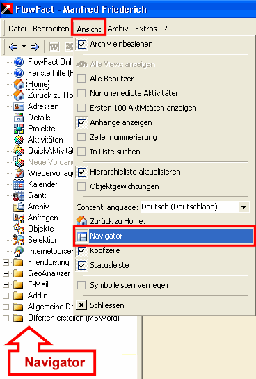 Der Navigator (zu sehen am linken Fensterrand, sofern über Menü Ansicht aktiv) dient, wie die Symbol- bzw. Menüleiste, zum Auslösen bestimmter Programmfunktionen bzw. Befehle. Der Navigator bietet allerdings besondere Vorteile: