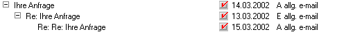 Wenn Sie eine E-Mail-Nachricht beantworten, erzeugt FlowFact automatisch eine Kopie der Original-Nachricht und verkettet beide. Das Original behält somit immer seine ursprünglichen Form, Ihre Antwort befindet sich in der Kopie, beide Aktivitäten gehören zu einem Vorgang (künftige darauf basierende E-Mails werden diesem Vorgang hinzugefügt). Auf diese Weise erhalten Sie immer eine lückenlose, chronologisch aufgebaute E-Mail-Hierarchie und die Übersicht bleibt erhalten.