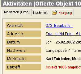 Auch auf Daten, die mit der Aktivität verknüpft sind, wird in Form von Links hingewiesen. Ein Mausklick öffnet das jeweilige Fenster, um dort den dazugehörigen Datensatz anzuzeigen. |