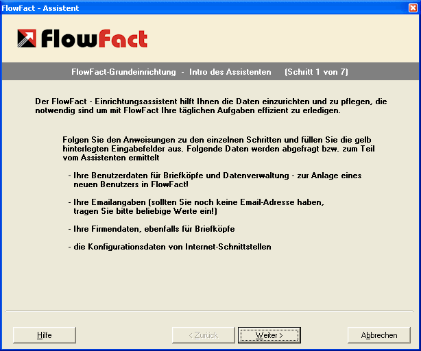 Haben Sie FlowFact neu installiert, so erscheint der Grundeinrichtungs-Assistent nach dem Start automatisch.