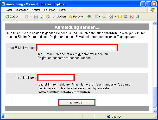 mit der Informations- und Anmelde-Seite. Füllen Sie die Felder am Ende
