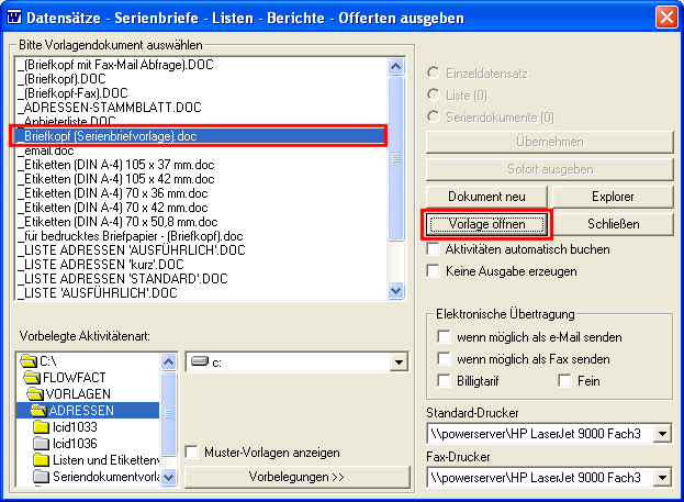 Da es sich bei Word-Vorlagen, wie oben bereits erwähnt, um normale Word-Dateien handelt, sind diese unter deren Dateinamen mit der Endung *.Doc auf dem Rechner bzw. Server gespeichert. FlowFact bietet dazu zwei Ordner, die zur Speicherung der Word-Dateien vorgesehen sind: