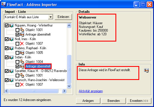 Der FlowFact AdressImporter ist in der Lage Interessenten-Anfragen, die über Online-Portale automatisch gerierten und als E-Mail angekommenen Daten auszuwerten und systemgerecht aufzubereiten: z.B. Adresse und Anfrage anlegen und über die Aktivität mit dem Objekt verknüpfen, etc. Welche Portale unterstützt werden entnehmen Sie bitte aus der Seite AdressImporter oder unserer Versionshistorie im Internet www.flowfact.de/support/updateinfos.